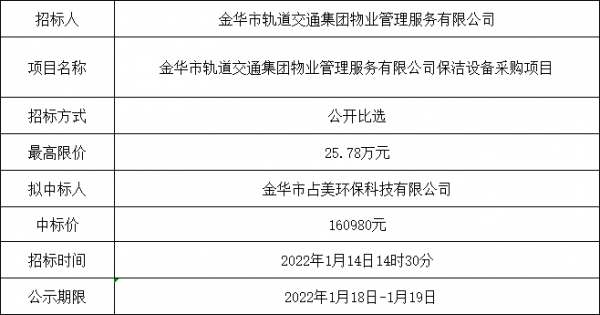 金華市軌道交通集團(tuán)物業(yè)管理服務(wù)有限公司保潔設(shè)備采購(gòu)項(xiàng)目中選公告
